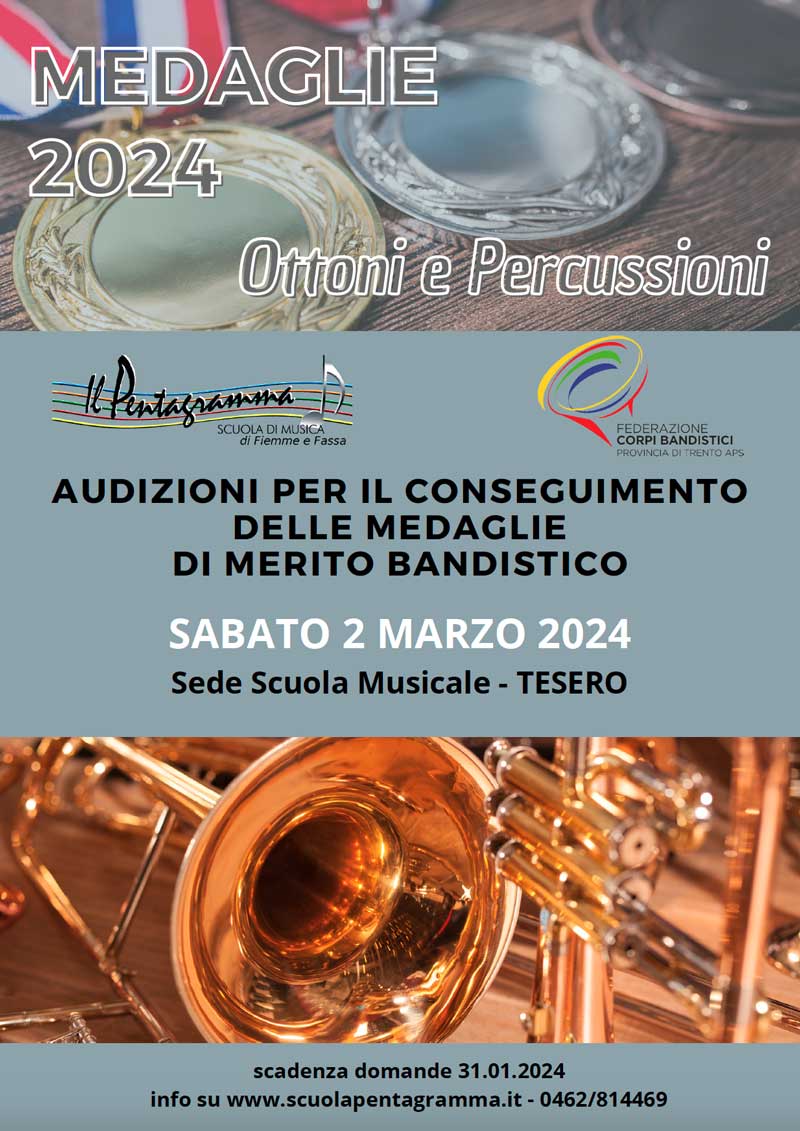 La scuola di Musica “Il Pentagramma” è lieta di comunicarvi l’ormai consueto appuntamento delle “Audizioni per il conseguimento delle MEDAGLIE 2024 al merito bandistico”.